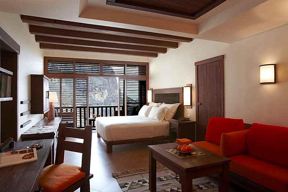 Spacious room featuring a seating area with games table, a flat-screen TV with satellite channels, an iPod Universal Docking Station, and a private balcony with picturesque views of mountains and valleys. The private bathroom comes with shower.
